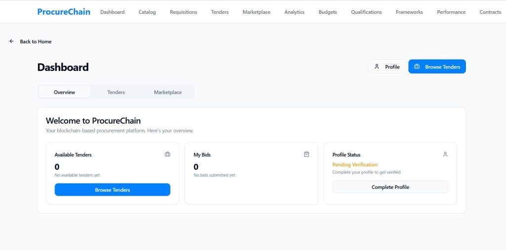 ProcureChain exists today as a working proof-of-concept. The core consensus algorithm is functional and the blockchain infrastructure is operational. The basic web dashboard allows verification workflow management. What ProcureChain does not have yet is production deployments with real companies processing actual procurement transactions.